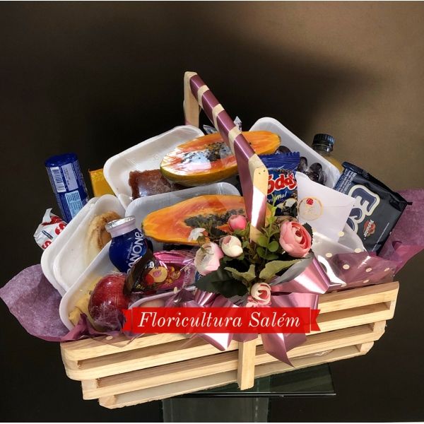 Nesta cesta, acompanha um café da manhã completo! Incluindo, frutas como: banana, pêra, uva, melão, pães de queijo, suco, achocolatado, pão c/queijo, iogurte e diversos outros itens para reforçar mais ainda o seu café da manhã! Que tal surpreender com esta cesta recheada?!