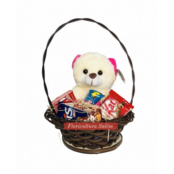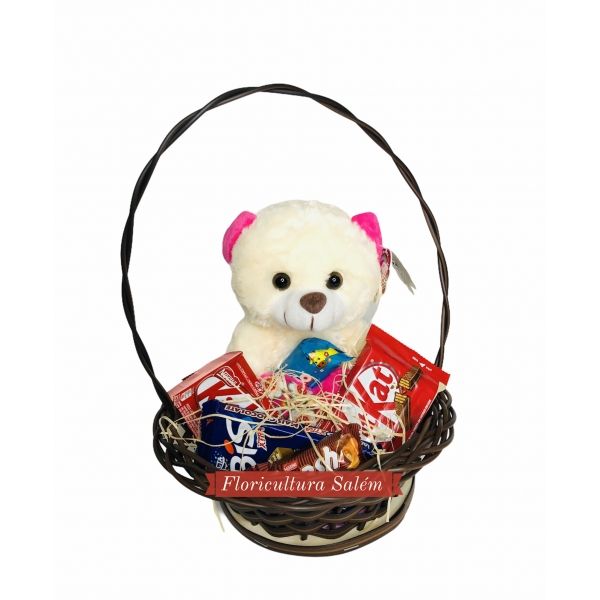A cesta é feita em vime sintético reforçado, acompanhada de um urso de pelúcia pequeno com chocolates variados como kitkat, bis, entre outros!