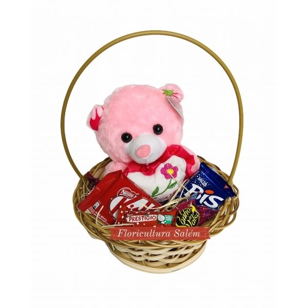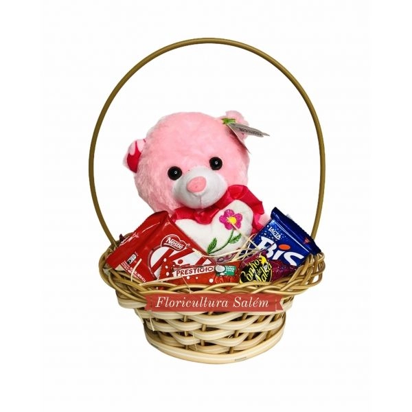 A cesta é feita em vime sintético reforçado, acompanhada de um urso de pelúcia pequeno com chocolates variados como kitkat, bis, entre outros!