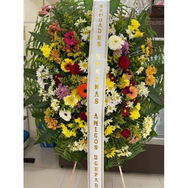 Coroa Fúnebre com flores do campo e rosas variadas, acompanha tripé e faixa para dedicatória (Frase).